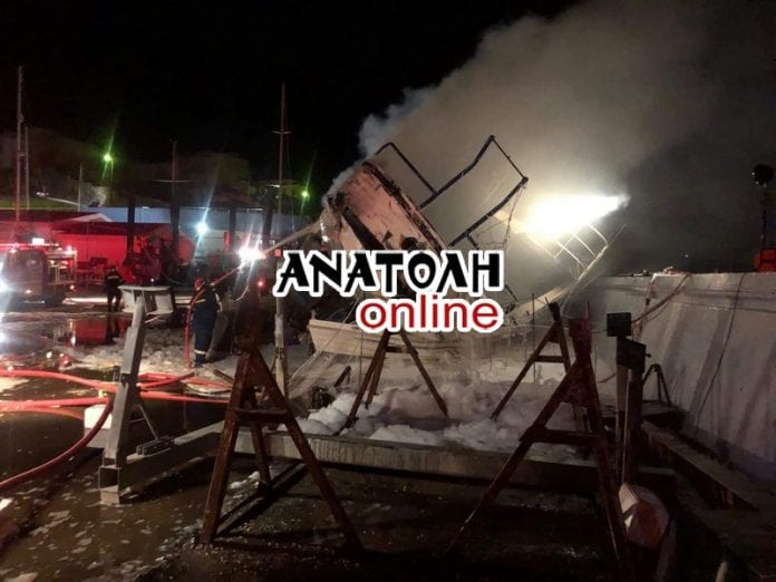 Η φωτιά ξέσπασε από άγνωστη μέχρι στιγμής αιτία σε ένα ξύλινο καΐκι που ήταν παρατημένο σε μια άκρη.