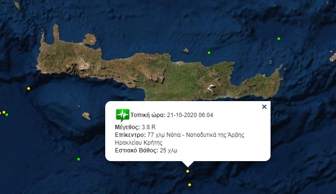 Πιο συγκεκριμένα σεισμός έντασης 3,8 βαθμών της κλίμακας Ρίχτερ σημειώθηκε στις 6:04 το πρωί 77 χλμ Νότια – Νοτιοδυτικά της Άρβης, στο Ηράκλειο. Το εστιακό βάθος του σεισμού υπολογίζεται στα 25 χλμ.