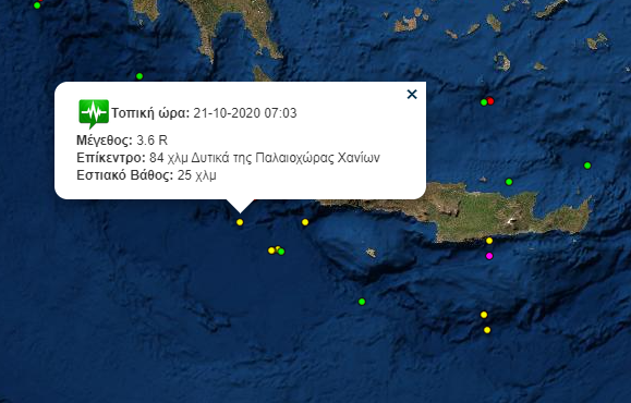 Μία ώρα αργότερα, στις 7:03, σεισμική δόνηση σημειώθηκε στα Χανιά. Ο σεισμός έντασης 3,6 Ρίχτερ είχε επίκεντρο την θαλάσσια περιοχή 84 χλμ Δυτικά της Παλαιοχώρας και εστιακό βάθος 25 χλμ.