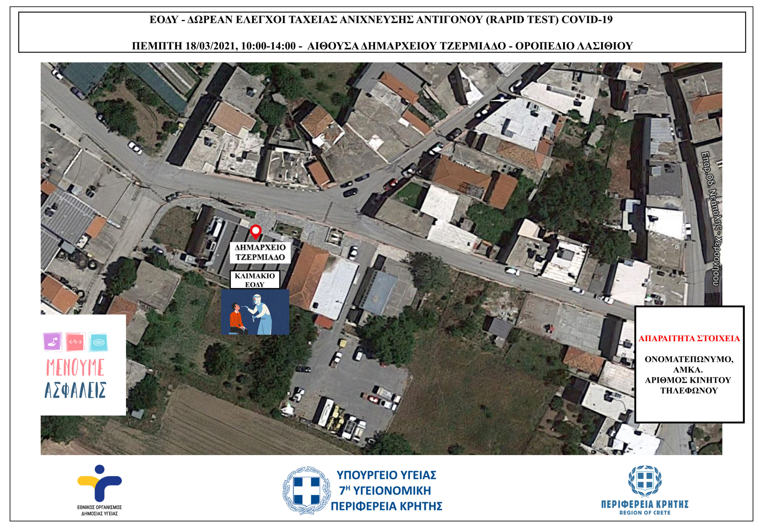 Έλεγχοι ταχείας ανίχνευσης αντιγόνου Covid-19 (rapid test) σε πεζούς, θα πραγματοποιηθούν την Πέμπτη 18/03/2021 από κλιμάκια του ΕΟΔΥ στο Τζερμίαδο Λασιθίου.