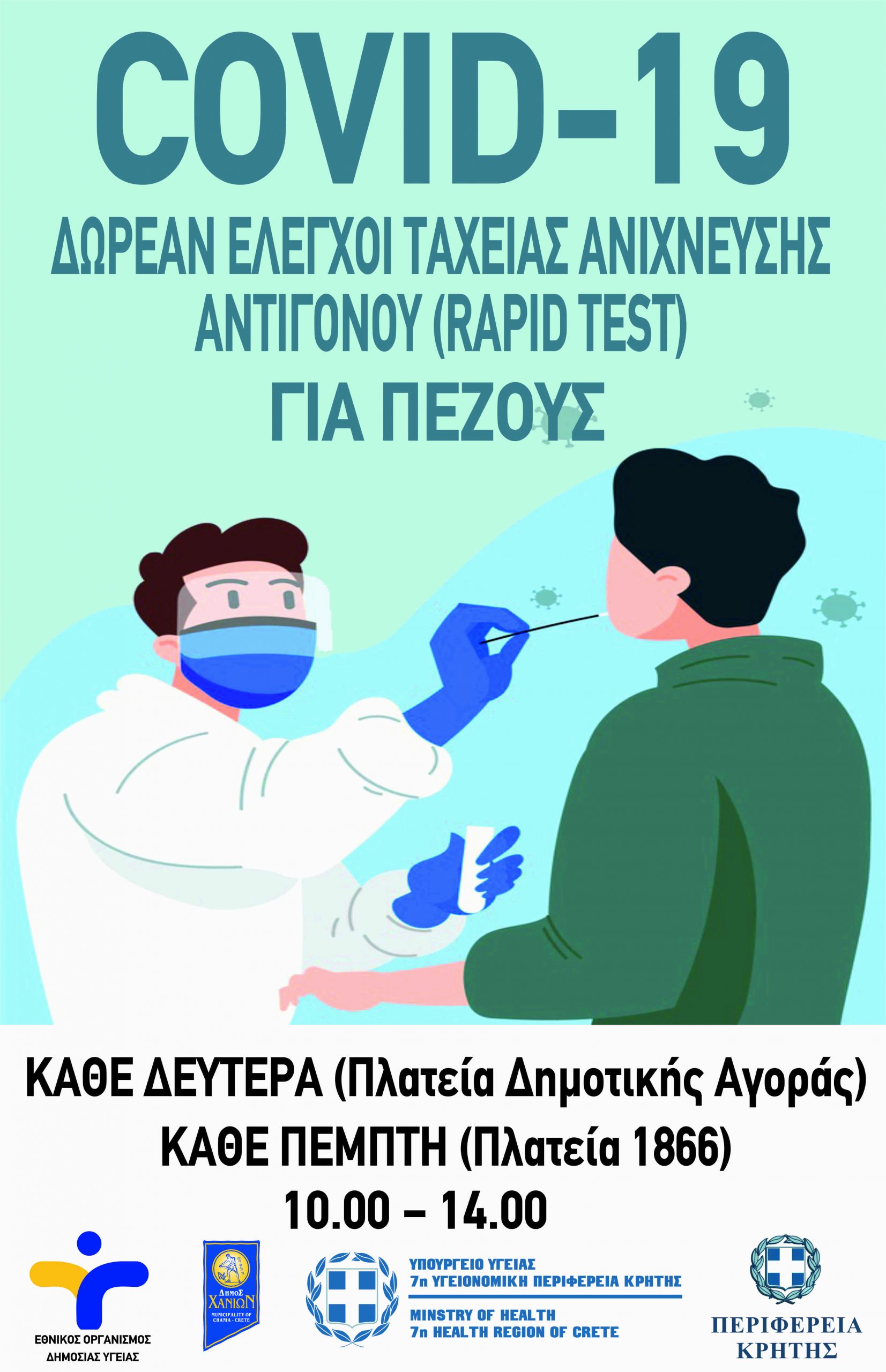 Δωρεάν rapid test για την ανίχνευση του COVID-19 σε πεζούς θα διεξάγει ο ΕΟΔΥ κάθε Δευτέρα στην Πλατεία Δημοτικής Αγοράς και κάθε Πέμπτη στην Πλατεία 1866, σε συνεργασία με την 7η ΥΠΕ, την Περιφέρεια Κρήτης / Περιφερειακή Ενότητα Χανίων και το Δήμο Χανίων.