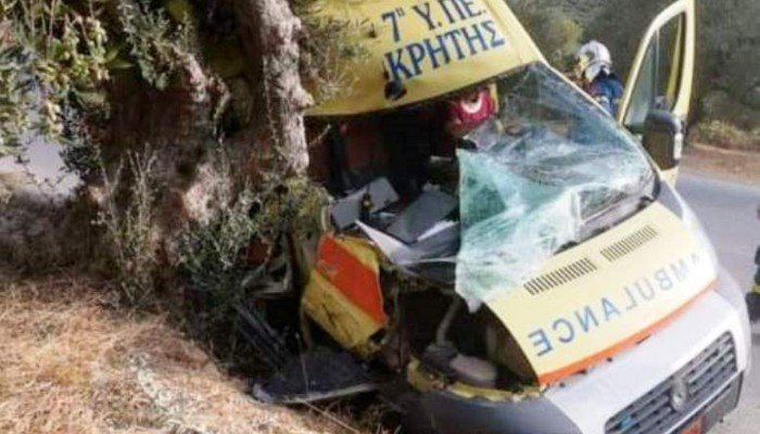 Μέσα στο ασθενοφόρο εγκλωβίστηκε το πλήρωμα των διασωστών, γιατρός και οδηγός και στο σημείο μετέβησαν 4 πυροσβέστες από την Π.Υ. Κισάμου.
