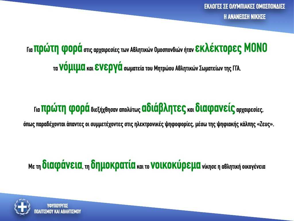 «Οι εκλογικές διαδικασίες ολοκληρώθηκαν με απόλυτη τάξη, απόλυτη διαφάνεια και με υψηλότατο βαθμό ανανέωσης των αθλητικών φορέων.