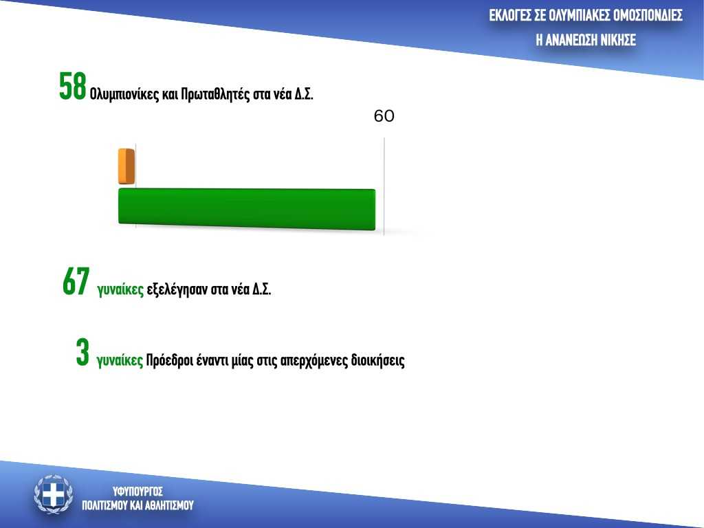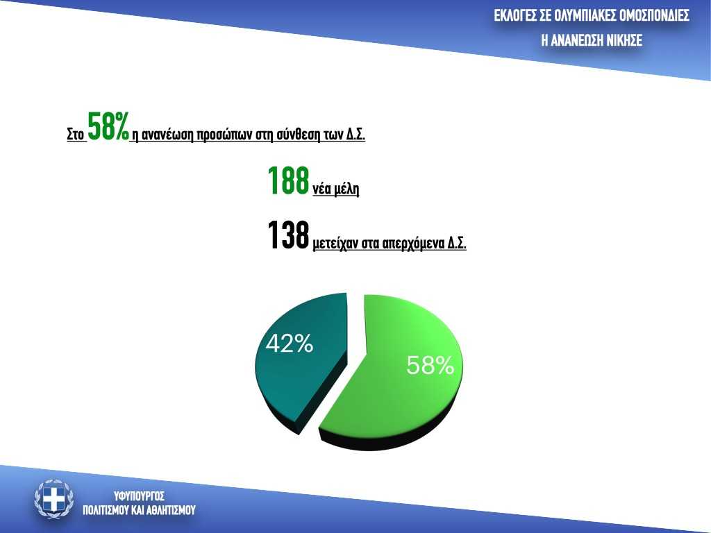Στο 16% ανήλθε η συμμετοχή των αθλητών/τριών (58 Ολυμπιονίκες και Πρωταθλητές) ως μέλη στα νέα ΔΣ. Αυτή η συμμετοχή θα αυξηθεί σημαντικά, καθώς σε αρκετά ΔΣ Ομοσπονδιών δεν έχει ακόμα οριστεί και ο επιπλέον, εκ του νόμου, εκπρόσωπος των αθλητών/τριών.