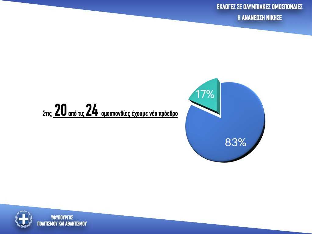 Στις 20 από τις 24 Ομοσπονδίες (83%) έχουμε νέο πρόεδρο (συνυπολογιζόμενης και της ΕΠΟ –Θοδωρής Ζαγοράκης- στην οποία δεν ψηφίζουν τα σωματεία, αλλά οι Ενώσεις).
