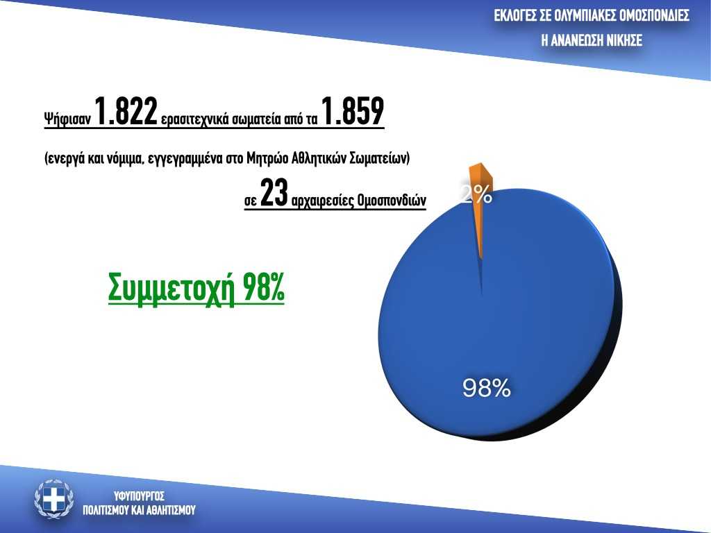 Στις αρχαιρεσίες σε 23 Ολυμπιακές Ομοσπονδίες η συμμετοχή ήταν 98%! Ψήφισαν 1.822 ερασιτεχνικά σωματεία (στα 1.859 που είχαν δικαίωμα, ως ενεργά και νόμιμα, εγγεγραμμένα στο Μητρώο Αθλητικών Σωματείων), χωρίς π.χ. να συνυπολογίζονται περισσότερα από 500 σωματεία που θα μετάσχουν στις εκλογές –προσεχώς- της Καλαθοσφαίρισης (μπάσκετ).