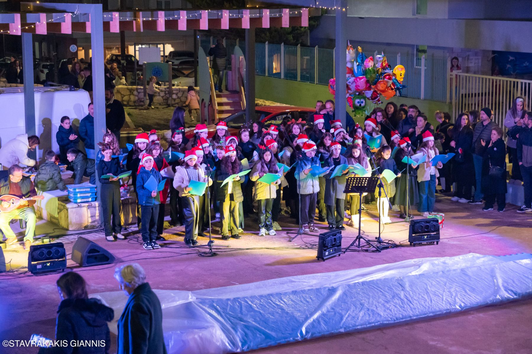 Ακολούθησαν χριστουγεννιάτικα τραγούδια και κάλαντα από τη χορωδία του 1ου και 2ου Δημοτικού Σχολείου Αρκαλοχωρίου, που «πλημμύρισαν» την πλατεία με παιδικές φωνές και γιορτινή διάθεση.