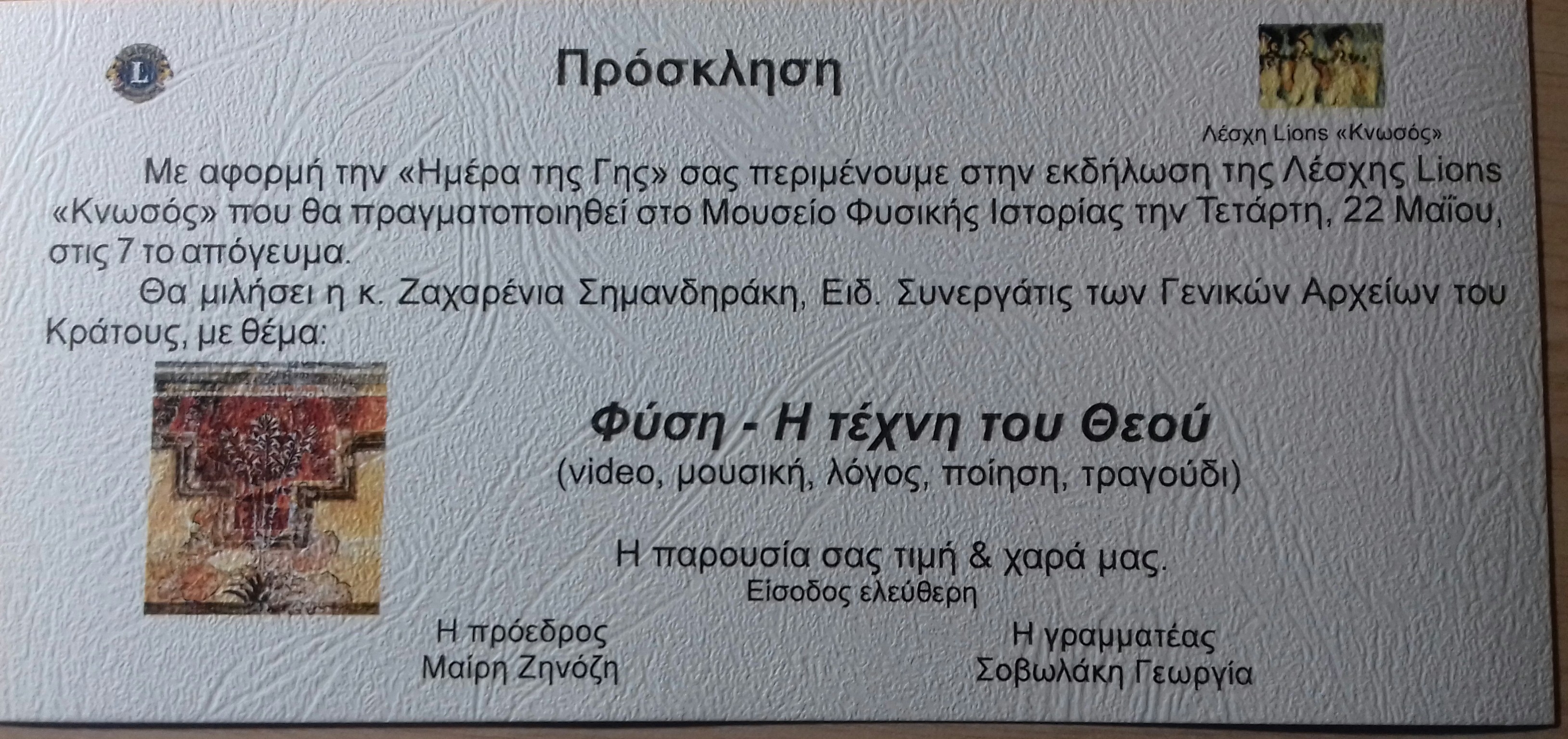 Η Λέσχη LIONS KNOSSOS με αφορμή την παγκόσμια «ΗΜΕΡΑ ΤΗΣ ΓΗΣ» σας καλεί στην εκδήλωση που θα πραγματοποιηθεί στο Μουσείο Φυσικής Ιστορίας την Τετάρτη 22 Μαΐου 2019 στις 7 το απόγευμα.