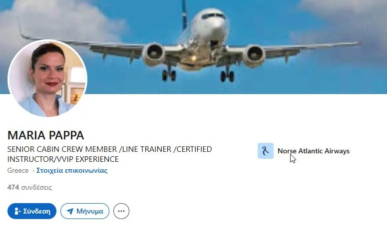 Η προϊστάμενη καμπίνας, όπως αναφέρει στα προφίλ της, με καταγωγή από τη Ρόδο, είχε μεγάλη εμπειρία και προϋπηρεσία, ενώ τα τελευταία χρόνια δούλευε σε lear jet με ιδιωτικές πτήσεις κυρίως. Ανάμεσα στα αεροσκάφη στα οποία εργαζόταν συχνά, ήταν και το μοιραίο Falcon.