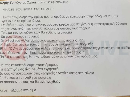 «Παιδιά και γυναίκες θα σκοτωθούν μόνο αν μπουν στο δρόμο μας», «θα σε πνίξουμε στο αίμα» και «το αίμα των εκπαιδευτικών θα χυθεί στα σχολεία» είναι μόνο μερικές από τις απειλές που αναφέρονται στο εν λόγω email.