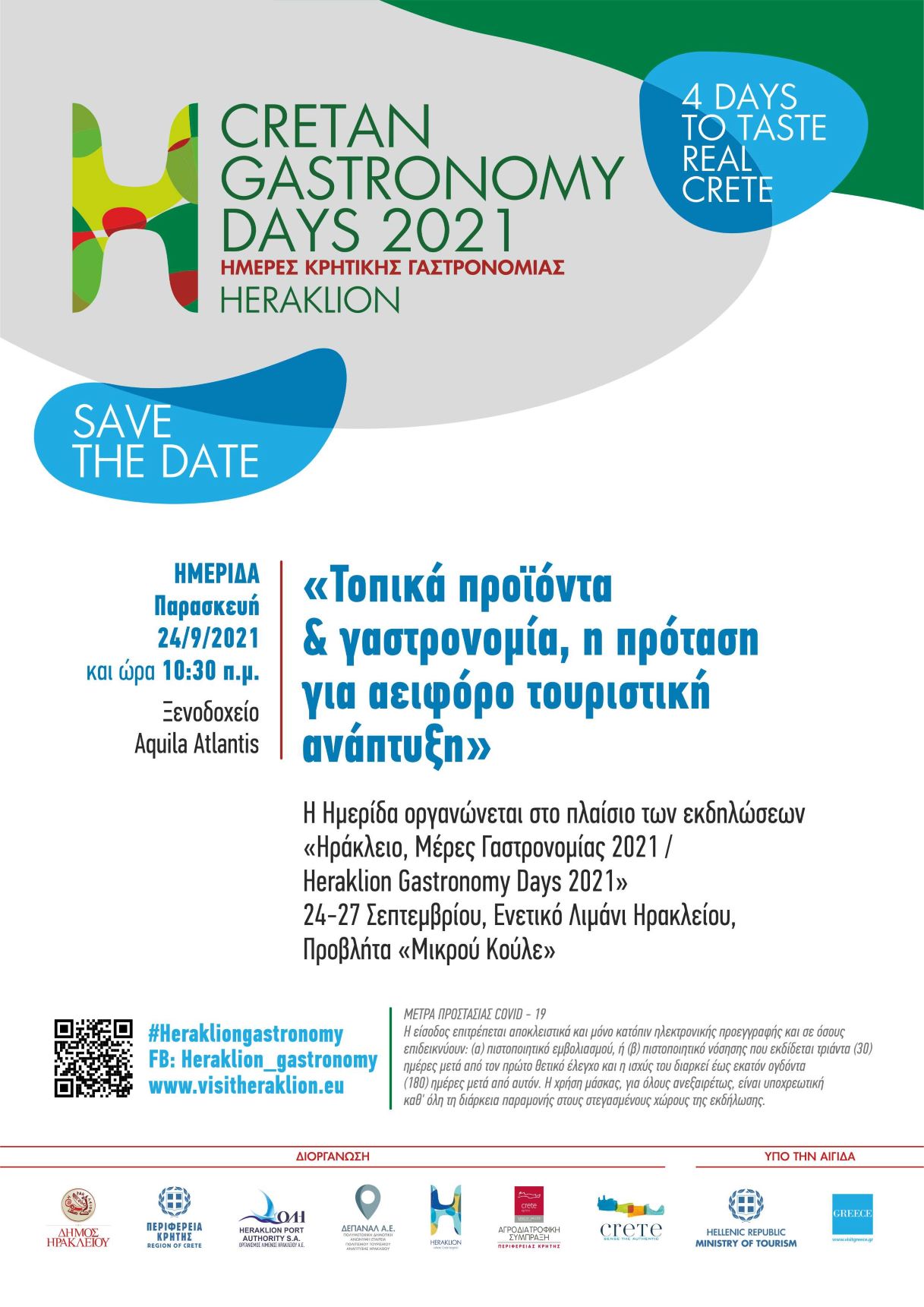 Με μία ημερίδα με θέμα τα «Τοπικά προϊόντα και γαστρονομία, η πρόταση για αειφόρο τουριστική ανάπτυξη» θα ανοίξει η αυλαία των εκδηλώσεων «Ηράκλειο, Μέρες Γαστρονομίας 2021/Heraklion Gastronomy Days 2021» που διοργανώνει ο Δήμος Ηρακλείου με την Περιφέρεια Κρήτης, τον Οργανισμό Λιμένος Ηρακλείου, τη ΔΕΠΑΝΑΛ Α.Ε., την Αγροδιατροφική Σύμπραξη στο Ενετικό Λιμάνι της πόλης. Η ημερίδα θα ξεκινήσει στις 10:30 το πρωί στο ξενοδοχείο Aquila Atlantis με τη συμμετοχή των συναρμόδιων φορέων.