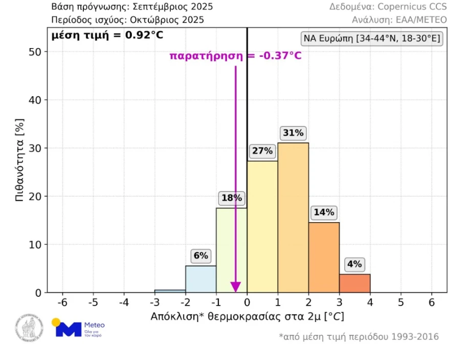 Όσον αφορά τον περασμένο Οκτώβριο, η μέση θερμοκρασιακή απόκλιση στην ΝΑ Ευρώπη ήταν -0.37°C, ενώ η μέση τιμή όλων των σεναρίων της μακροπρόθεσμης πρόγνωσης που εκδόθηκε τον Σεπτέμβριο του 2025 ήταν +0.92°C. Όπως φαίνεται στο παρακάτω γράφημα, το μέγεθος της απόκλισης που παρατηρήθηκε είχε πιθανότητα 18% και ήταν το 3ο πιθανότερο πεδίο τιμών στην μακροπρόθεσμη πρόγνωση.