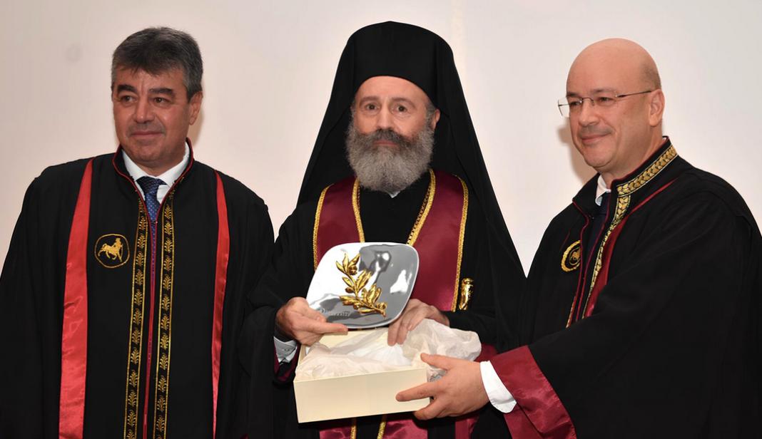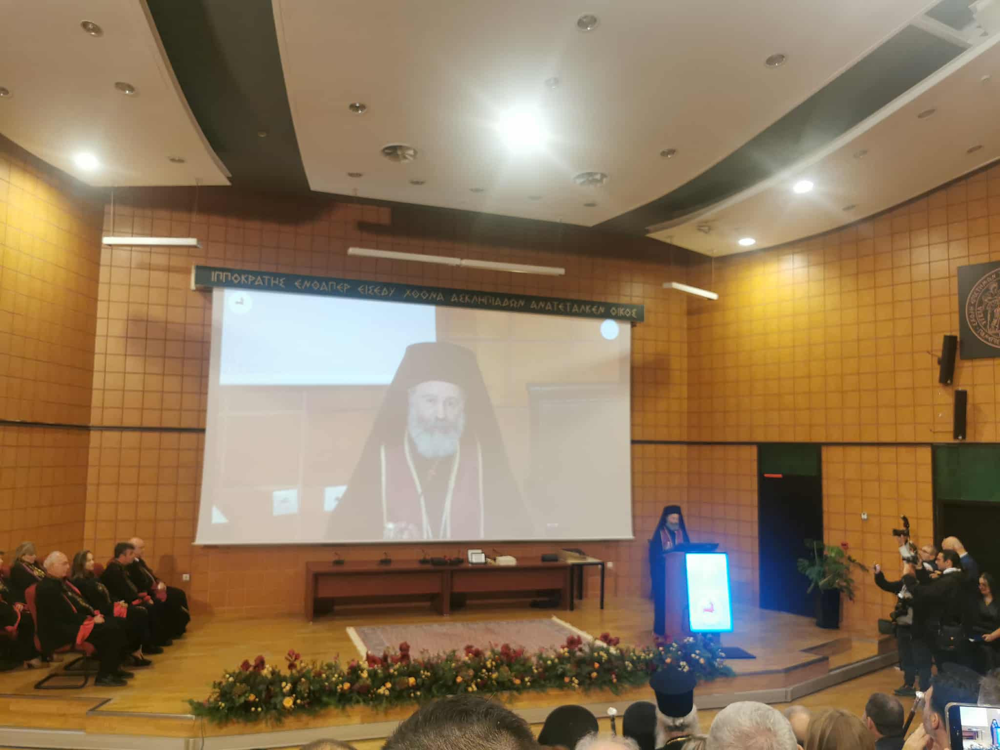 Ο Πρύτανης του Πανεπιστημίου Θεσσαλίας, Καθηγητής Χαράλαμπος Μπιλλίνης απηύθυνε την επίσημη προσφώνηση, υπογραμμίζοντας τη διεθνή ακτινοβολία και τη διαρκή προσφορά του Αρχιεπισκόπου στην κοινωνία και την εκπαίδευση.