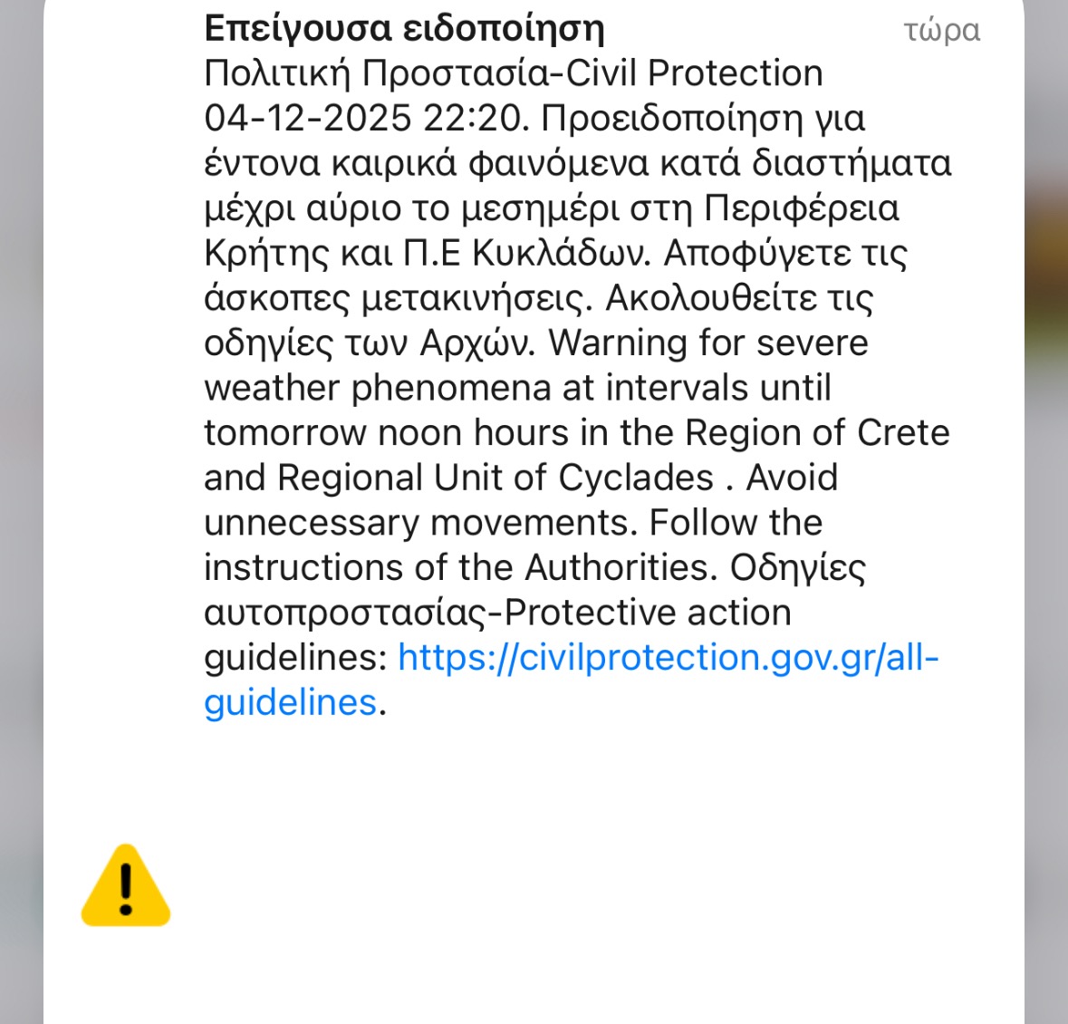 Η Πολιτική Προστασία, στο μήνυμά τους στους κατοίκους του νησιού, αναφέρει: «Προειδοποίηση για έντονα καιρικά φαινόμενα κατά διαστήματα μέχρι αύριο το μεσημέρι στην Περιφέρεια Κρήτης και Π.Ε. Κυκλάδων».