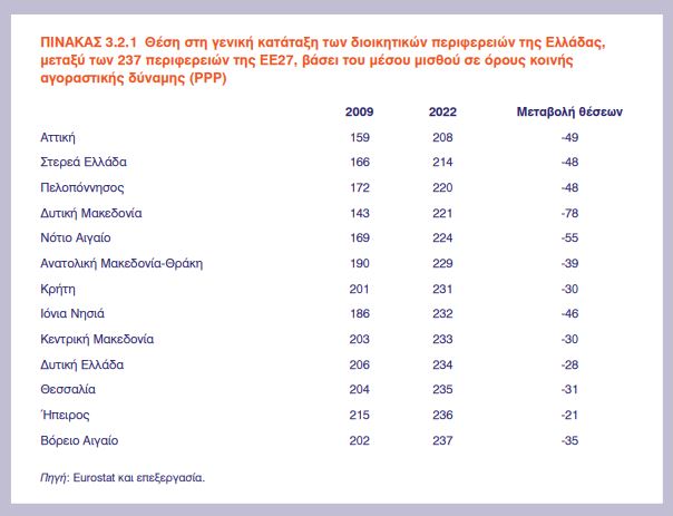 Μεταξύ των 237 περιφερειών της Ευρωπαϊκής Ένωσης (ΕΕ27), οι ελληνικές καταλαμβάνουν πλέον τις τελευταίες θέσεις ως προς το επίπεδο του μέσου μισθού. Το 2009, η περιφέρεια Βορείου Αιγαίου βρισκόταν στην 202η θέση, ενώ το 2022 κατατάσσεται στην 237η, δηλαδή στην τελευταία. Αντίστοιχα, η περιφέρεια Ηπείρου ακολουθεί στην προτελευταία θέση (236η). Κατά μέσο όρο, την περίοδο 2009-2022, οι ελληνικές περιφέρειες έχουν υποχωρήσει κατά περίπου 40 θέσεις στην ευρωπαϊκή κατάταξη. Όσον αφορά την Κρήτη, από την 201η θέση το 2009 έπεσε στην 232