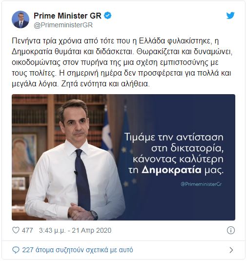 Αυτό αναφέρει ο πρωθυπουργός, Κυριάκος Μητσοτάκης, στο μήνυμά του για την επέτειο του πραξικοπήματος της 21ης Απριλίου.
