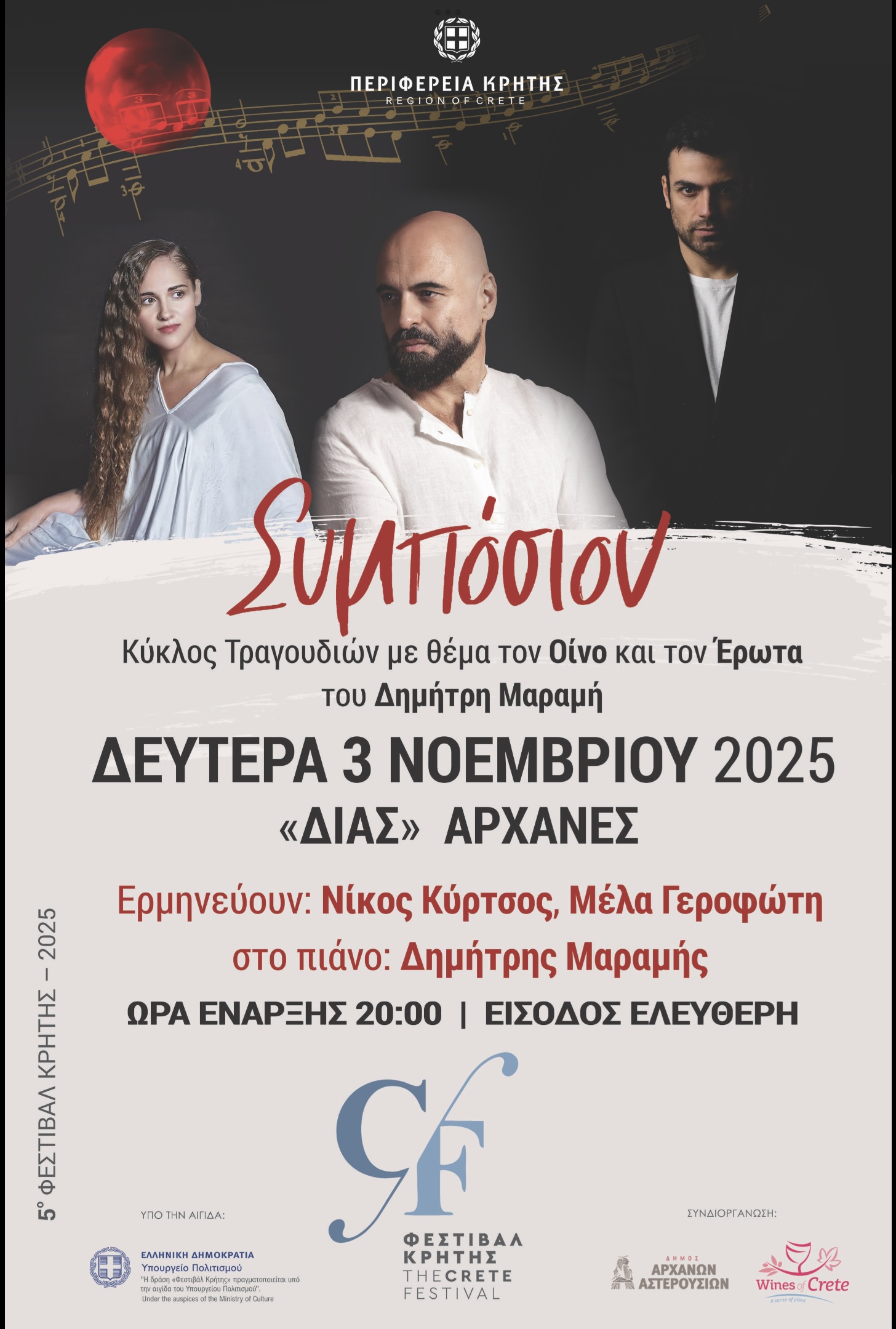Η μουσική εκδήλωση,”Συμπόσιον” με τον γνωστό μουσικοσυνθέτη Δημήτρη Μαραμή και τους συνεργάτες του θα γίνει στο κέντρο σεμιναρίων & εκπαίδευσης «ΔΙΑΣ» των Αρχανών όπου και θα παρουσιαστεί ένας κύκλος 12 τραγουδιών με θέμα τον Οίνο και τον Έρωτα, μέσα από διαφορετικές εποχές της ελληνικής ποίησης, αναδεικνύοντας την πολιτισμική και συμβολική αξία του κρασιού, στην αδιάκοπη πορεία της ελληνικής γλώσσας στο μάκρος των αιώνων. Μελοποιείται: αρχαία, ελληνιστική, βυζαντινή, δημοτική, φαναριώτικη, μεσοπολεμική και σύγχρονη ελληνική ποίηση. Ποιήματα και κείμενα των: Ανακρέοντα, Eυαγγελιστή Ιωάννη, Αθ. Χριστόπουλου, Γ. Δροσίνη, Κ. Π. Καβάφη, Κ. Κρυστάλλη, Λ. Πορφύρα, Ν. Λαπαθιώτη, Ν. Καζαντζάκη, Γ. Ρίτσου και ερμηνεύονται σε αφηγηματική πρόζα κείμενα των: Ομήρου, Εύβουλου Πλάτωνα και άλλων.