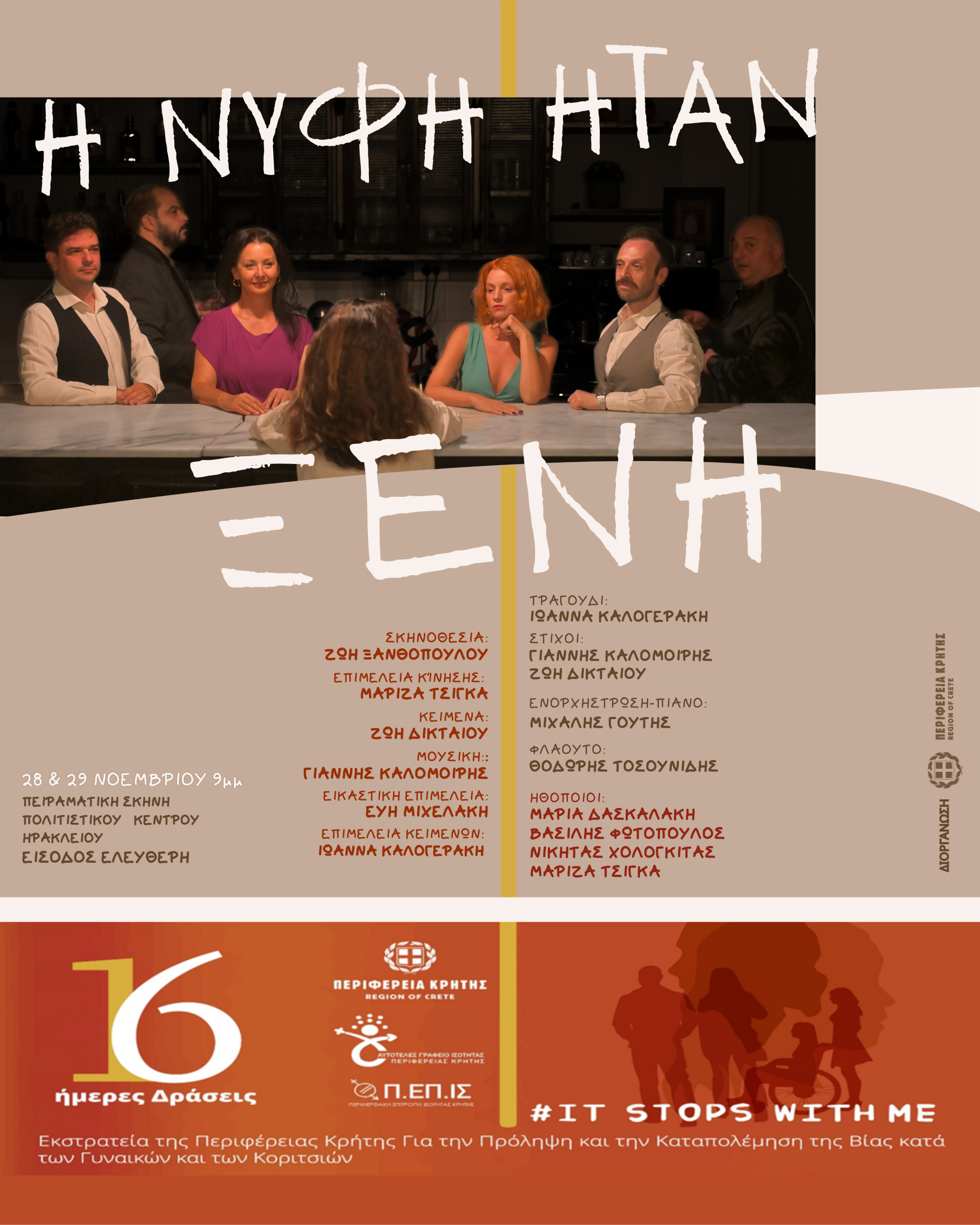 Την Παρασκευή 28 Νοεμβρίου 2025, παρουσιάζεται η μουσικό-θεαττική παράσταση «Η νύφη ήταν ξένη», στην Πειραματική Σκηνή, του Πολιτιστικού Συνεδριακού Κέντρου Ηρακλείου, στις 9:00μ.μ., στο πλαίσιο των 16ήμερων Δράσεων της Περιφέρειας Κρήτης για την Πρόληψη και την Αντιμετώπιηση της Βίας κατά των Γυναικών και των Κοριτσιών, με ελεύθερη είσοδο για το κοινό.