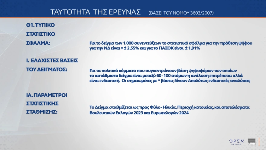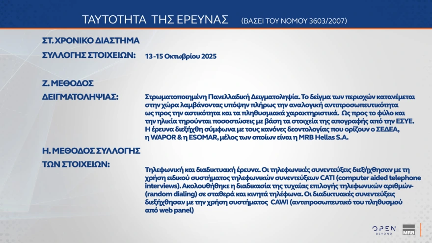 Την «ακτινογραφία» των πολιτικών και κοινωνικών εξελίξεων, την παραίτηση του Αλέξη Τσίπρα, την εμπιστοσύνη στην Δικαιοσύνη με αφορμή Τέμπη και ΟΠΕΚΕΠΕ, το Μνημείο του Άγνωστου Στρατιώτη και την υπόθεση του Πάνου Ρούτσι, καταγράφει η δημοσκόπηση της MRB που παρουσιάστηκε το βράδυ της Πέμπτης στο κανάλι Open. Στις 14,2 μονάδες προσδιορίζεται το προβάδισμα της ΝΔ έναντι του ΠΑΣΟΚ, ενώ η Μαρία Καρυστιανού θα μπορούσε να φτάσει ως το 32% αν έπαιρνε την απόφαση να φτιάξει κόμμα. Τι λένε οι πολίτες για κόμμα Τσίπρα, Σαμαρά.