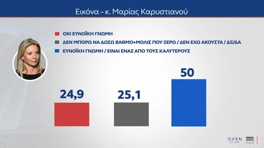 Για την Μαρία Καρυστιανού και για την δημοτικότητά της, το 50% έχει ευνοϊκή γνώμη, το 24,9% μη ευνοϊκή ενώ το 25,1% δεν μπορεί να απαντήσει.