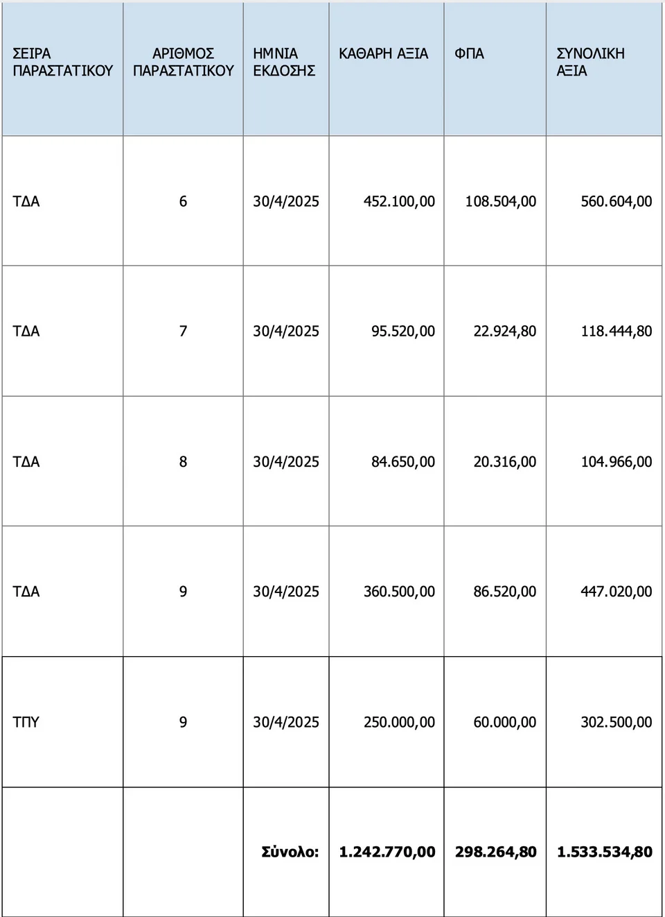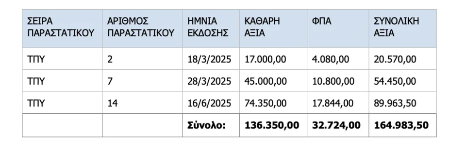 Επίσης, εταιρεία στην οποία ήταν μέλος ο Χρήστος Πρίτσας κατά 50%, φέρεται να έλαβε από τη «MEGA SPECIAL CONSTRUCTIONS ΜΟΝΟΠΡΟΣΩΠΗ ΙΚΕ» τα εξής εικονικά τιμολόγια: