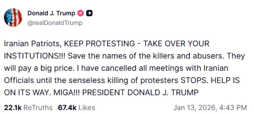 Ο Ντόναλντ Τραμπ, με ανάρτησή του στην πλατφόρμα Truth Social, κάλεσε τους Ιρανούς διαδηλωτές να «συνεχίσουν να διαδηλώνουν», προειδοποιώντας ότι οι «δολοφόνοι και κακοποιητές θα πληρώσουν μεγάλο τίμημα», χωρίς ωστόσο να διευκρινίζει τι μορφή θα μπορούσε να λάβει η υποσχόμενη βοήθεια.