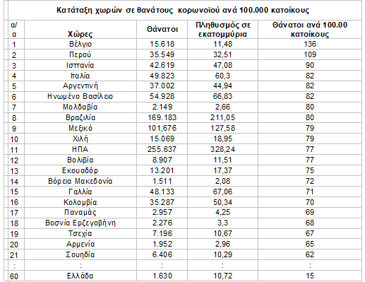 Η συνεχής και εκθετική εξάπλωση των κρουσμάτων, παγκοσμίως, οδηγεί σε συμφόρηση τα συστήματα υγείας και σε δεκάδες θανάτους. Στον παρακάτω πίνακα, φαίνονται 21 χώρες με τους περισσότερους θανάτους ανά εκατό χιλιάδες κατοίκους και στο τέλος φαίνεται η χώρα μας στη 60 θέση. Πρώτη χώρα είναι το Βέλγιο με 136 θανάτους, η Ισπανία είναι στην τρίτη θέση με 90 θανάτους, με την Ιταλία στην τέταρτη θέση με 82 θανάτους.