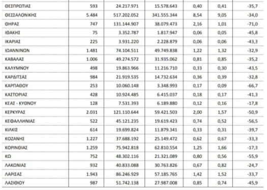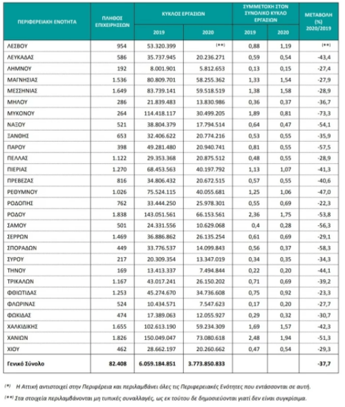 Από τα αναλυτικά στοιχεία ανά περιοχή, που δημοσιοποίησε η ΕΛΣΤΑΤ, προκύπτει ότι ο κλάδος έχασε πέρσι το 37,7% του τζίρου του 2019, συνεπώς το όριο του 30% για την υπαγωγή στο νέο πρόγραμμα είναι «κλειδί», αν λάβει κανείς υπόψιν ότι σε πολλές περιοχές η μείωση του τζίρου ήταν μικρότερη ή πολύ μικρότερη. Η μεγαλύτερη πτώση τζίρου του κλάδου καταγράφεται στη Μύκονο (73,3%) και η μικρότερη στην Κόρινθο (17,3%)