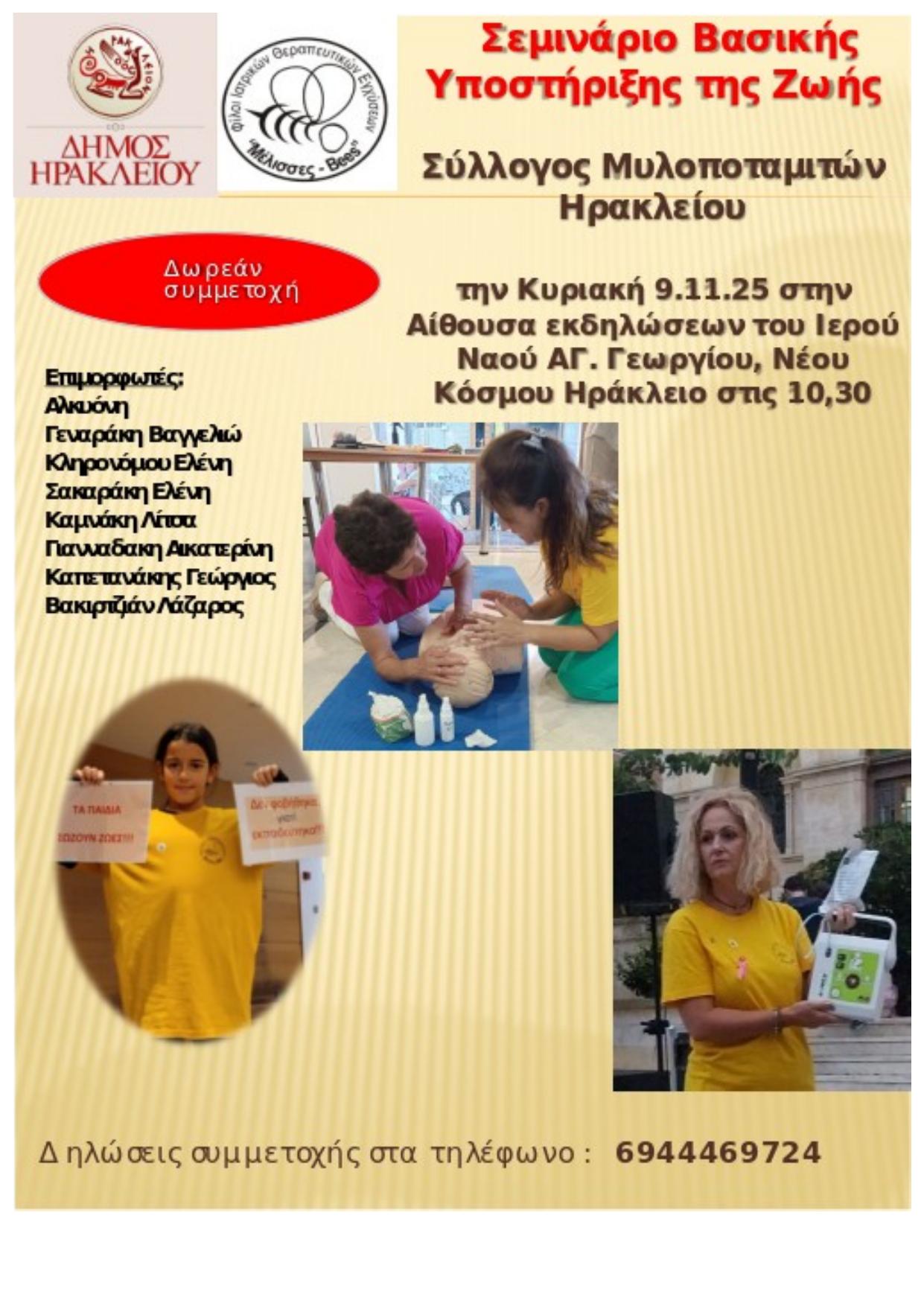 Νέο σεμινάριο Βασικής Υποστήριξης της Ζωής θα πραγματοποιηθεί την Κυριακή 9 Νοεμβρίου από τον Δήμο Ηρακλείου στο πλαίσιο των δράσεων της Αντιδημαρχίας Εθελοντισμού με τίτλο «Προσφορά στο συνάνθρωπο». Η δράση υλοποιείται σε συνεργασία με την ομάδα εθελοντών «Οι φίλοι Ιατρικών Θεραπευτικών Εγχύσεων Μέλισσες-Bees», υπό την εποπτεία του φυσίατρου Λάζαρου Βακιρτζιάν και το σύλλογο Μυλοποταμιτών Ηρακλείου.