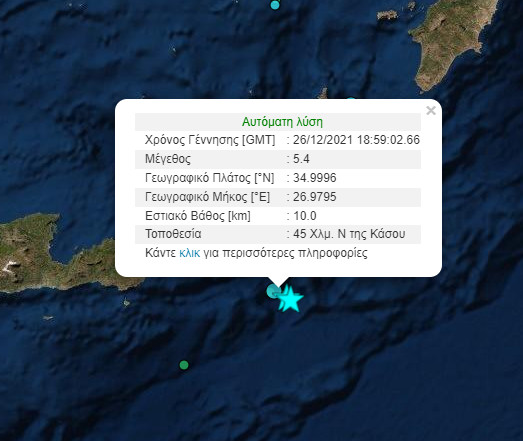 Σύμφωνα με την Αυτόματη λύση του Γεωδυναμικού Ινστιτούτου, ο σεισμός έχει εστιακό βάθος τα 10 χλμ., ενώ σημειώθηκε στα 45 χλμ. νότια της Κάσου.