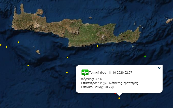 ΚΡΗΤΗΚΟΙΝΩΝΙΑ Νέος σεισμός νότια της Κρήτης Κυριακή 11 Οκτ 2020 | 09:28 FacebookTwitterViberWhatsAppEmailCopy URL Πρέπει να διαβάσετε Σεισμική δόνηση σημειώθηκε τα ξημερώματα νότια της Κρήτης. Ο σεισμός έντασης 3,6 βαθμών της Κλίμακας Ρίχτερ σημειώθηκε στις 02:27. Το επίκεντρό του εντοπίζεται 111 χλμ Νότια της Ιεράπετρας, ενώ το εστιακό του βάθος υπολογίζεται στα 20 χλμ. Σχετικά άρθρα Χανιά: Αυτή είναι η ποινή που επιβλήθηκε στον οδηγό της Porsche για το τροχαίο με θύμα τον 22χρονο Παναγιώτη Τετάρτη 21 Ιαν 2026 | 17:13 Γαύδος: Οι θυελλώδεις άνεμοι βύθισαν δέκα σκάφη – Bίντεο του Creta24 Τετάρτη 21 Ιαν 2026 | 16:36 Χανιά: Ένοχος ο οδηγός της Porsche για το θάνατο του Παναγιώτη Καρατζή Τετάρτη 21 Ιαν 2026 | 16:02 Το έργο – ανάσα που θα «ξεδιψάσει» το Ηράκλειο Τετάρτη 21 Ιαν 2026 | 15:40 Άλλα Πρόσφατα Χανιά: Αυτή είναι η ποινή που επιβλήθηκε στον οδηγό της Porsche για το τροχαίο με θύμα τον 22χρονο Παναγιώτη Τετάρτη 21 Ιαν 2026 | 17:13 Σε ποιους νομούς πωλούνται τα περισσότερα αυτοκίνητα; Ξεχωρίζουν τρεις νομοί της Κρήτης Τετάρτη 21 Ιαν 2026 | 17:13 Πιθανότατα αύριο στο Νταβός ο Μητσοτάκης λόγω κακοκαιρίας – Ουδείς Ευρωπαίος υπογράφει το Συμβούλιο Ειρήνης του Τραμπ Τετάρτη 21 Ιαν 2026 | 16:53 Γαύδος: Οι θυελλώδεις άνεμοι βύθισαν δέκα σκάφη – Bίντεο του Creta24 Τετάρτη 21 Ιαν 2026 | 16:36 Πώς σχολίασε ο Κόντης τη νέα μεταγραφή του ΟΦΗ – Τι είπε για ρόστερ και Παναιτωλικό Τετάρτη 21 Ιαν 2026 | 16:15