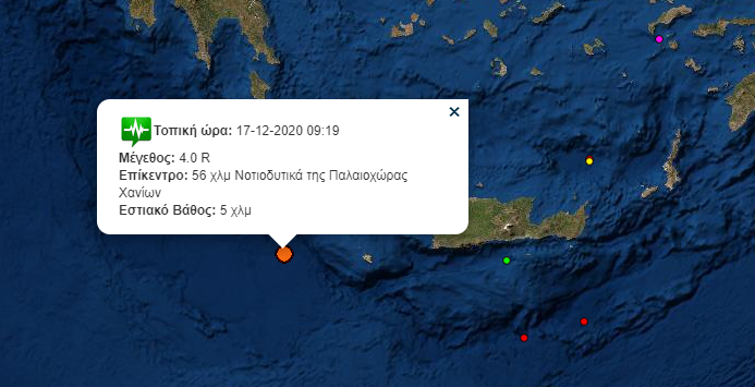 ΚΡΗΤΗΚΟΙΝΩΝΙΑ Νέος σεισμός στην Κρήτη Πέμπτη 17 Δεκ 2020 | 10:00 FacebookTwitterViberWhatsAppEmailCopy URL Πρέπει να διαβάσετε Σεισμός έντασης 4 Ρίχτερ σημειώθηκε το πρωί στην Κρήτη. Η σεισμική δόνηση, που σημειώθηκε στις 9:19, είχε επίκεντρο 56 χλμ Νοτιοδυτικά της Παλαιοχώρας Χανίων, ενώ το εστιακό βάθος υπολογίζεται στα 5 χλμ. Σχετικά άρθρα Ελένη Βατσινά: «Αναδρομικά και υπέρογκα πρόστιμα ΦΠΑ «πνίγουν» αγρότες, επαγγελματίες και Δήμους» Κυριακή 18 Ιαν 2026 | 09:33 Ηράκλειο: Ανοιχτά τα καταστήματα σήμερα – Το ωράριο Κυριακή 18 Ιαν 2026 | 08:56 Καιρός: Τοπικές βροχές και πτώση της θερμοκρασίας στην Κρήτη – Χιόνια στα ορεινά Κυριακή 18 Ιαν 2026 | 08:13 Ιεράπετρα: Απανθρακώθηκε ηλικιωμένος μετά από φωτιά στο σπίτι του Κυριακή 18 Ιαν 2026 | 08:03 Άλλα Πρόσφατα Ελένη Βατσινά: «Αναδρομικά και υπέρογκα πρόστιμα ΦΠΑ «πνίγουν» αγρότες, επαγγελματίες και Δήμους» Κυριακή 18 Ιαν 2026 | 09:33 Η Σάκκαρη πέτυχε τον πόντο της χρονιάς στο Australian Open Κυριακή 18 Ιαν 2026 | 09:22 Τραγωδία στις Άλπεις: Οκτώ νεκροί από χιονοστιβάδες μέσα σε στην ίδια ημέρα Κυριακή 18 Ιαν 2026 | 09:14 ΕKT: Γιατί επιμένει ο πληθωρισμός τροφίμων στην Ευρώπη – Τι οδηγεί στις αυξήσεις τιμών Κυριακή 18 Ιαν 2026 | 09:06 Ηράκλειο: Ανοιχτά τα καταστήματα σήμερα – Το ωράριο Κυριακή 18 Ιαν 2026 | 08:56