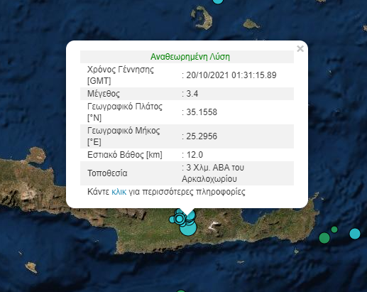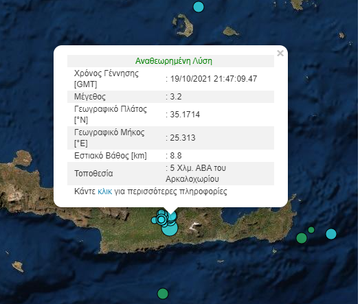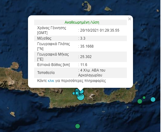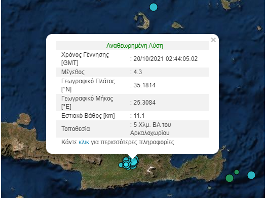 Ο σεισμός μεγέθους 4,3 Ρίχτερ, σημειώθηκε 5 Χλμ. βόριοανατολικά του Αρκαλοχωρίου σε εστιακό βάθος 11,1 χλμ και ήταν ιδιαίτερα αισθητός και στην πόλη του Ηρακλείου.