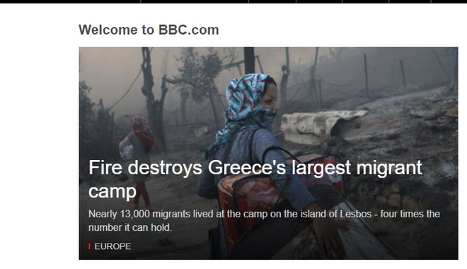 Πρώτη είδηση η καταστροφή για το BBC: Η φωτιά καταστρέφει το μεγαλύτερο ΚΥΤ στην Ελλάδα τιτλοφορείται η είδηση στην πρώτη σελίδα του βρετανικού δικτύου. “Σχεδόν 13.000 μετανάστες ζουν στο καμπ- αριθμός τετραπλάσιος της χωρητικότητάς του”.