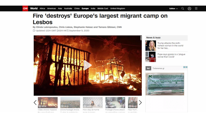 “Φωτιά καταστρέφει το μεγαλύτερο καμπ μεταναστών της Ευρώπης” τιτλοφορεί το CNN άρθρο του για τα γεγονότα στη Λέσβο.