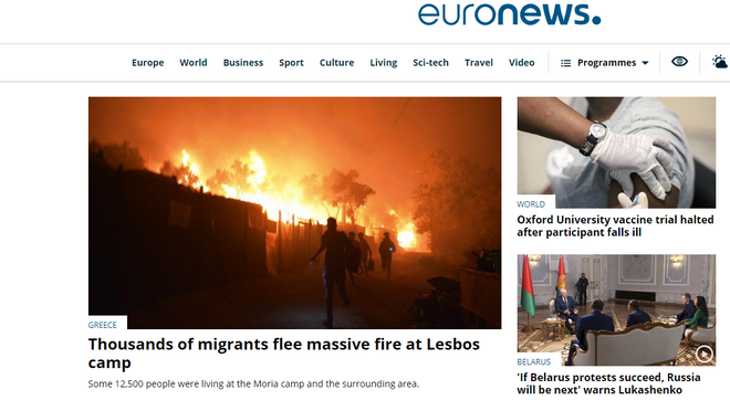 Πρώτο θέμα η Λέσβος και στην αγγλική υπηρεσία του euronews. “Χιλιάδες μετανάστες γλίτωσαν από τεράστια πυρκαγιά στο καμπ της Λέσβου”, αναφέρει στο κεντρικό του θέμα το ευρωπαϊκό δίκτυο.