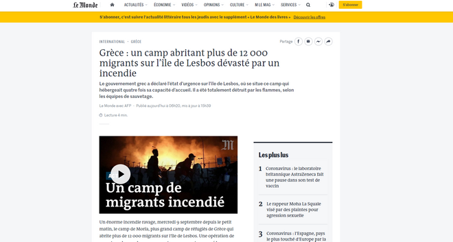 “Καμπ που φιλοξενούσε περισσότερους από 12.000 μετανάστες, στο νησί της Λέσβου, καταστρέφεται από φωτιά”, αναφέρει η γαλλική Le Monde, η οποία υπογραμμίζει ότι η δομή φιλοξενεί τετραπλάσιο πληθυσμό από την αρχική της χωρητικότητα.