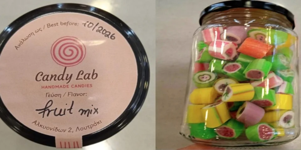 Καραμέλες «fruit mix» με ημερομηνία ανάλωσης ως 10/2026, συσκευασίας καθαρού βάρους περίπου 230g, το οποίο παράγεται και συσκευάζεται στην Ελλάδα από την «Candy Lab» που εδρεύει στο Λουτράκι Κορινθίας».