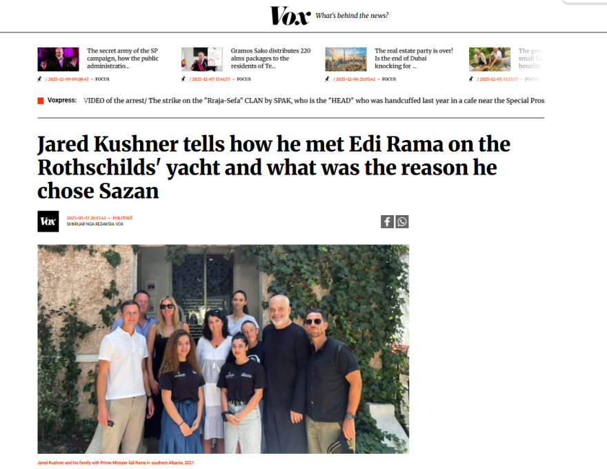 Μέχρι σήμερα, όπως εξηγεί, έχει συνεργαστεί μόνο με τον «Μπράιαν», τον εκπρόσωπο του Κούσνερ στην Αλβανία. Τον ίδιο τον γαμπρό του Τραμπ τον έχει συναντήσει μόλις μία φορά, σε εστιατόριο. «Ένας κοινός φίλος μάς σύστησε. Η συνάντηση ήταν απλώς ευγενική», λέει. «Δεν έχει έρθει ακόμη η στιγμή να πάμε μαζί στην παραλία».