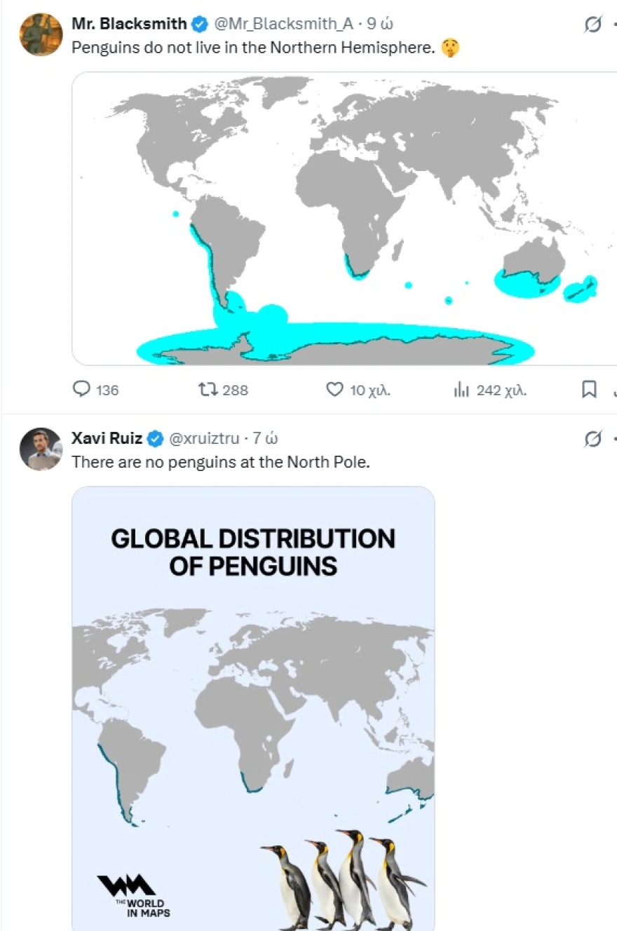 Και αν το μήνυμα που στέλνουν οι συγκεκριμένες αναρτήσεις είναι, από μόνο του, αρκετό από μόνο του για να κινητοποιήσει αρνητικά σχόλια, η παρουσία του πιγκουίνου εντείνει ακόμη περισσότερο τις αντιδράσεις. Ο λόγος; «Λάθος ημισφαίριο, δεν υπάρχουν πιγκουίνοι στο Βόρειο Ημισφαίριο, δεν υπάρχουν πιγκουίνοι στη Γροιλανδία» γράφουν οι περισσότεροι χρήστες που σχολιάζουν την ανάρτηση, προσθέτοντας πως «οι πιγκουίνοι ζουν αποκλειστικά στο Νότιο».