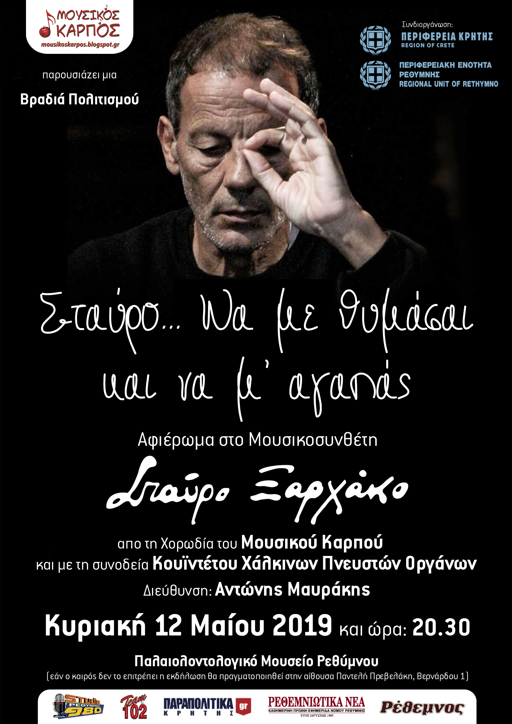 Ο Μουσικός Καρπός θα παρουσιάσει άλλη μία Βραδιά Πολιτισμού στο Ρέθυμνο με μουσικό θέμα: «Σταύρο … Να με θυμάσαι και να μ’ αγαπάς» με τη συνδιοργάνωση της Περιφέρειας Κρήτης & της Περιφερειακής Ενότητας Ρεθύμνου.