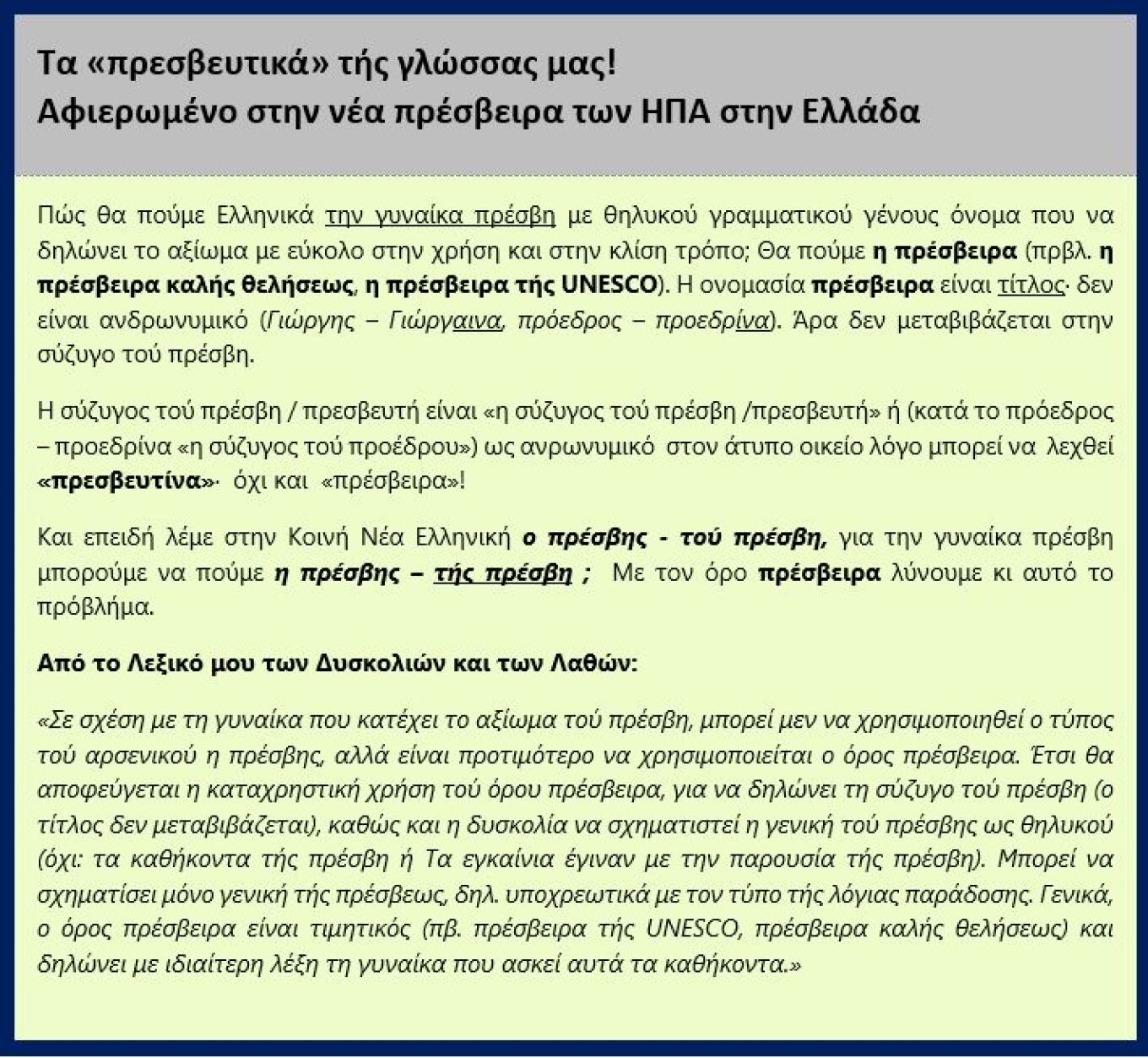Σύμφωνα με τον κ. Μπαμπινιώτη «η ονομασία πρέσβειρα είναι τίτλος δεν είναι ανδρωνυμικό».