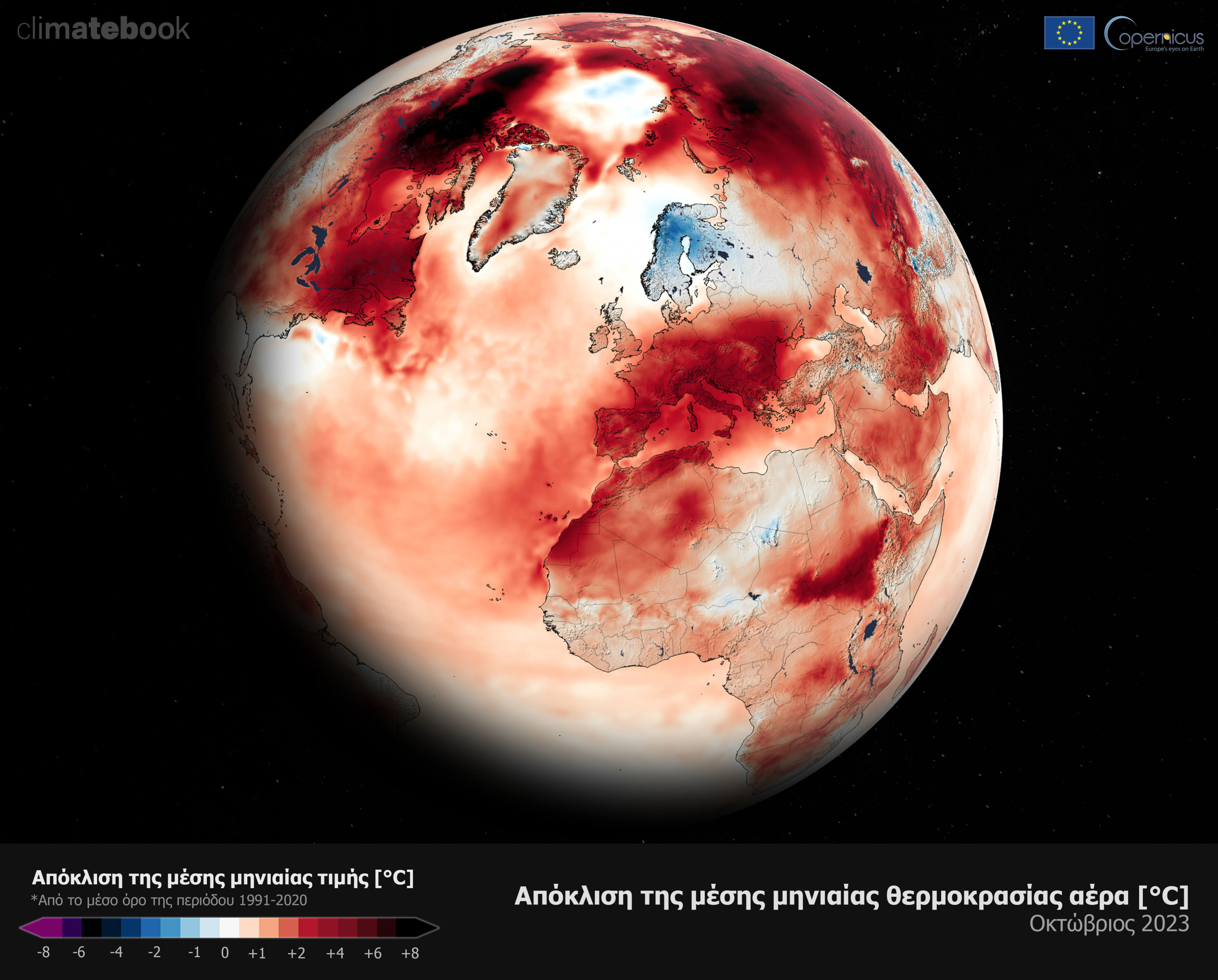 Στην Ελλάδα η θερμοκρασία τον Οκτώβριο του 2023 κυμάνθηκε αρκετά πάνω από το μέσο όρο της περιόδου 1991-2020, καταγράφοντας έναν από τους θερμότερους μήνες Οκτωβρίου των τελευταίων 30 ετών.