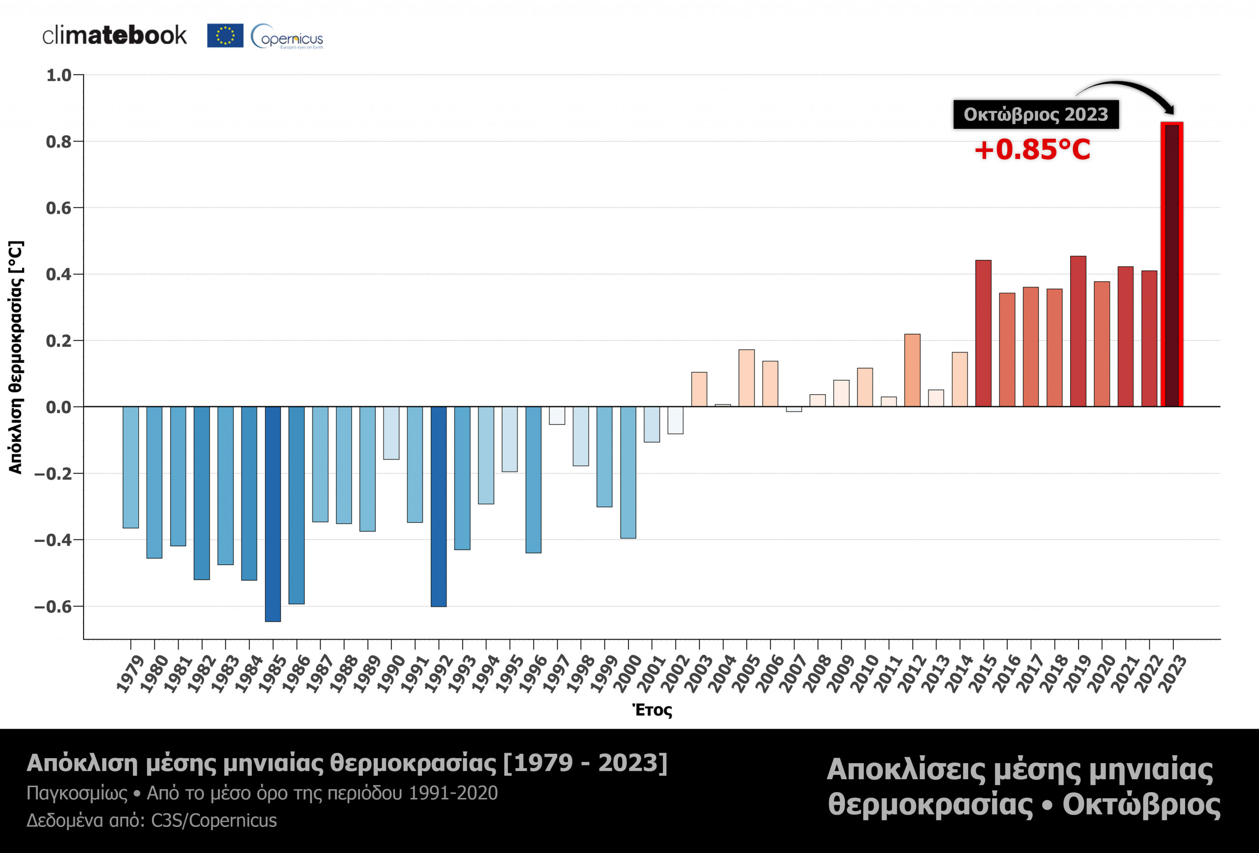 Μέχρι πρότινος, ο πιο θερμός Οκτώβριος παγκοσμίως ήταν αυτός του 2019 με απόκλιση 0,45°C πάνω από το μέσο όρο της περιόδου 1991-2020. Ο Οκτώβριος του 2023 κατέρριψε αυτό το ρεκόρ με διπλάσια τιμή, καταγράφοντας απόκλιση στους 0,85°C πάνω από τα επίπεδα της περιόδου 1991-2020. Αποτελεί τον 5ο συνεχόμενο μήνα μετά τους 3 θερινούς μήνες (Ιούνιο, Ιούλιο, Αύγουστο) και το Σεπτέμβριο του 2023, ο οποίος καταγράφεται ως ο θερμότερος στα χρονικά παγκοσμίως για το 2023.