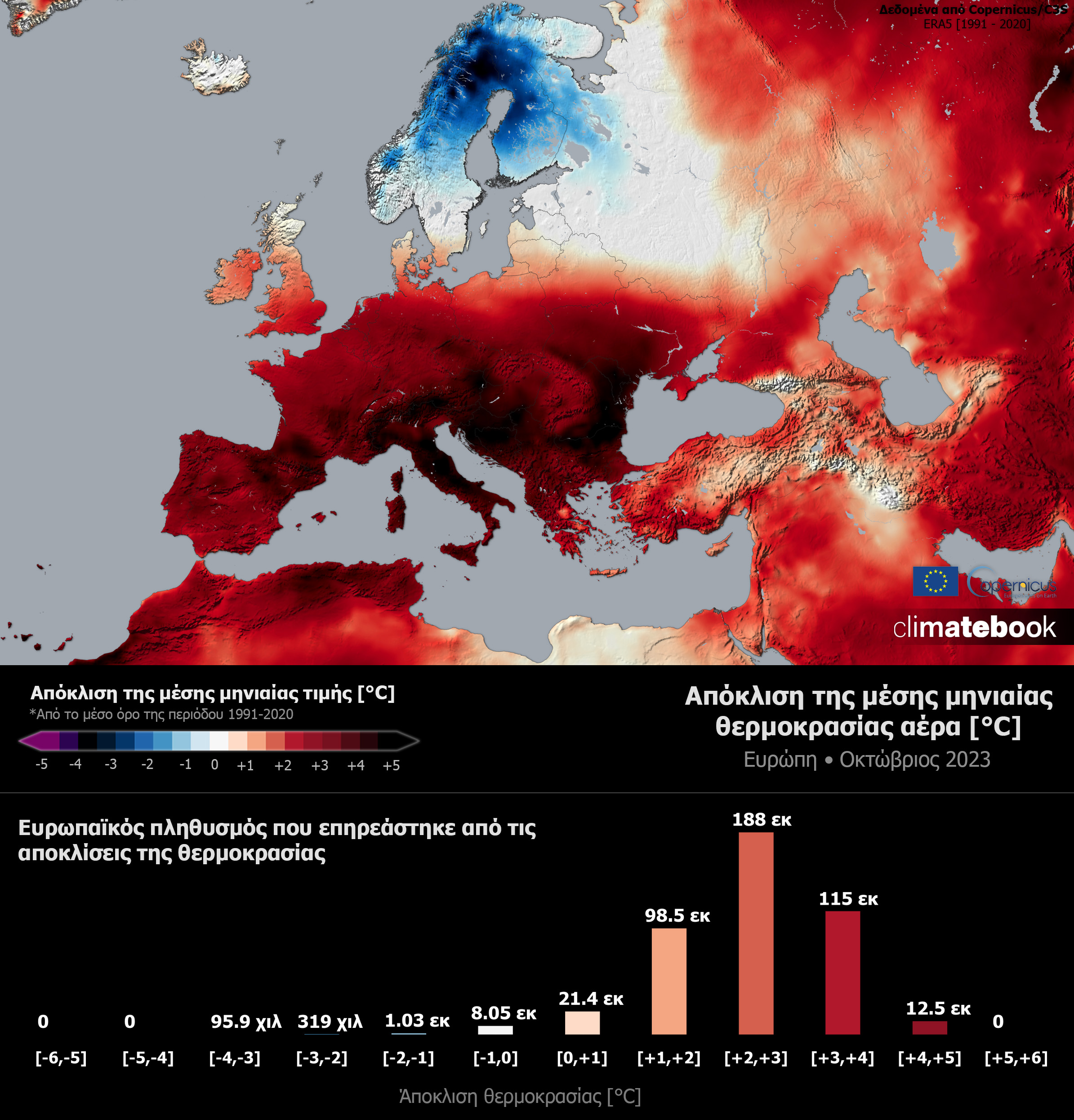 Σε επίπεδο Ευρώπης, ο Οκτώβριος του 2023 καταγράφηκε ως ο 4ος θερμότερος Οκτώβριος από το 1979. Ως θερμότερος παραμένει ο Οκτώβριος του 2022.