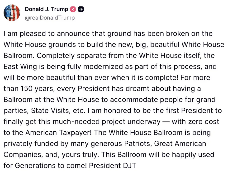 «Είμαι ευτυχής που ανακοινώνω ότι άρχισαν οι εργασίες στον Λευκό Οίκο για την οικοδόμηση της νέας, μεγάλης και όμορφης αίθουσας χορού», ανακοίνωσε ο ρεπουμπλικάνος μεγιστάνας μέσω Truth Social.