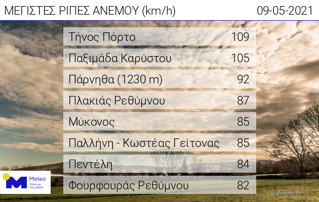 Σύμφωνα με τα προγνωστικά στοιχεία του Εθνικού Αστεροσκοπείου Αθηνών / Meteo.gr, πολύ ενισχυμένοι βόρειοι άνεμοι πνέουν στα ανατολικά ηπειρωτικά και στο Αιγαίο σήμερα Κυριακή, με τις ριπές του ανέμου στον Άγιο Ιωάννη – Πόρτο Τήνου να φτάνουν τα 109 km/h.