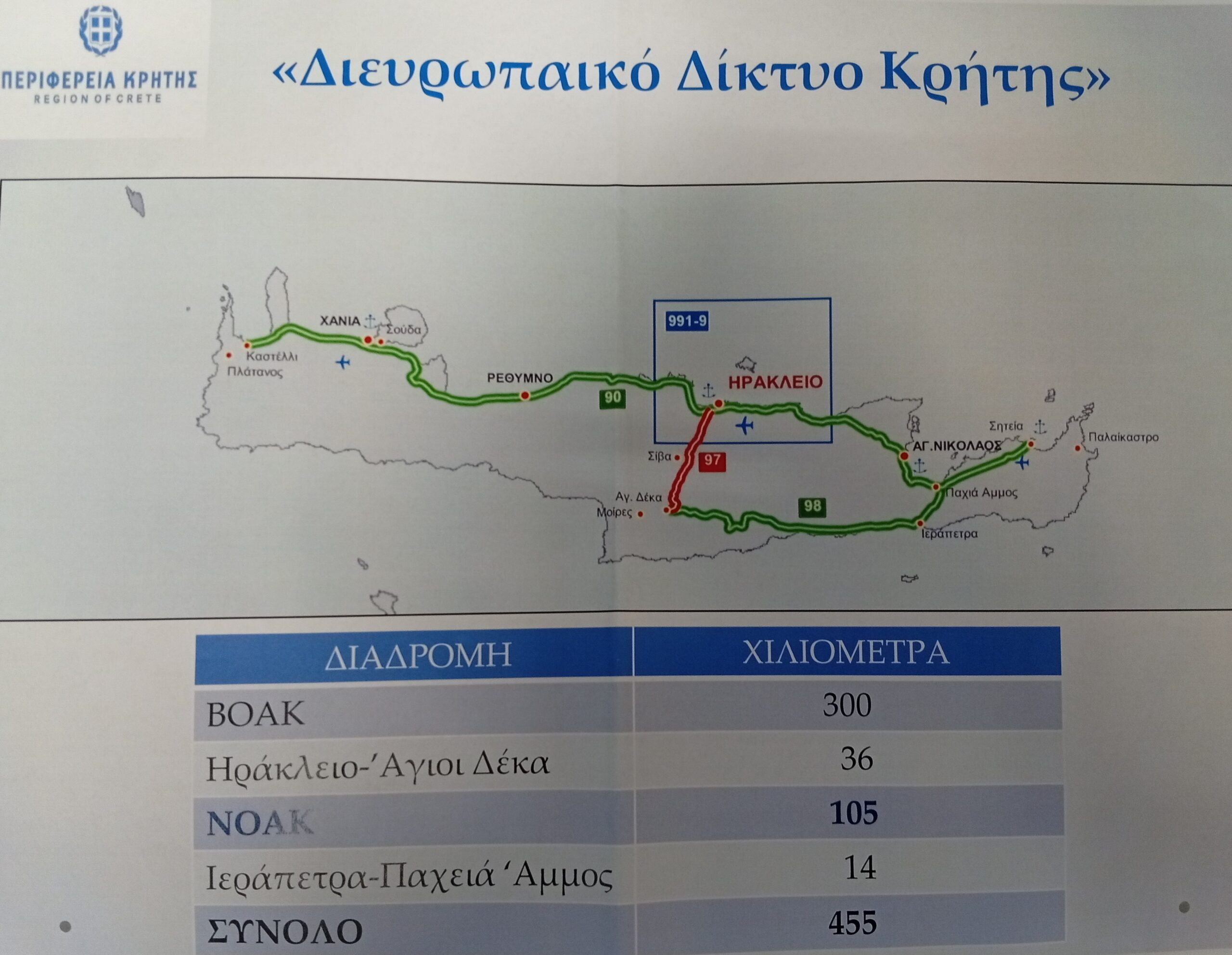 Ουσιαστικά σε επίπεδο Κρήτης έχει ολοκληρωθεί ο κάθετος οδικός άξονας που συνδέει το Ηράκλειο με τη Μεσαρά (με κάποιες μικρές αλλά σημαντικές εκκρεμότητες), τα τμήματα του ΒΟΑΚ “Χερσόνησος – Νεάπολη” (ΣΔΙΤ) και “Νεάπολη – Άγιος Νικόλαος” (δημόσιο έργο) είναι σε εξέλιξη ενώ εντός του τρέχοντος έτους θα ξεκινήσουν τα έργα στο μεγάλο τμήμα “Κίσσαμος – Ηράκλειο” (σύμβαση παραχώρησης).