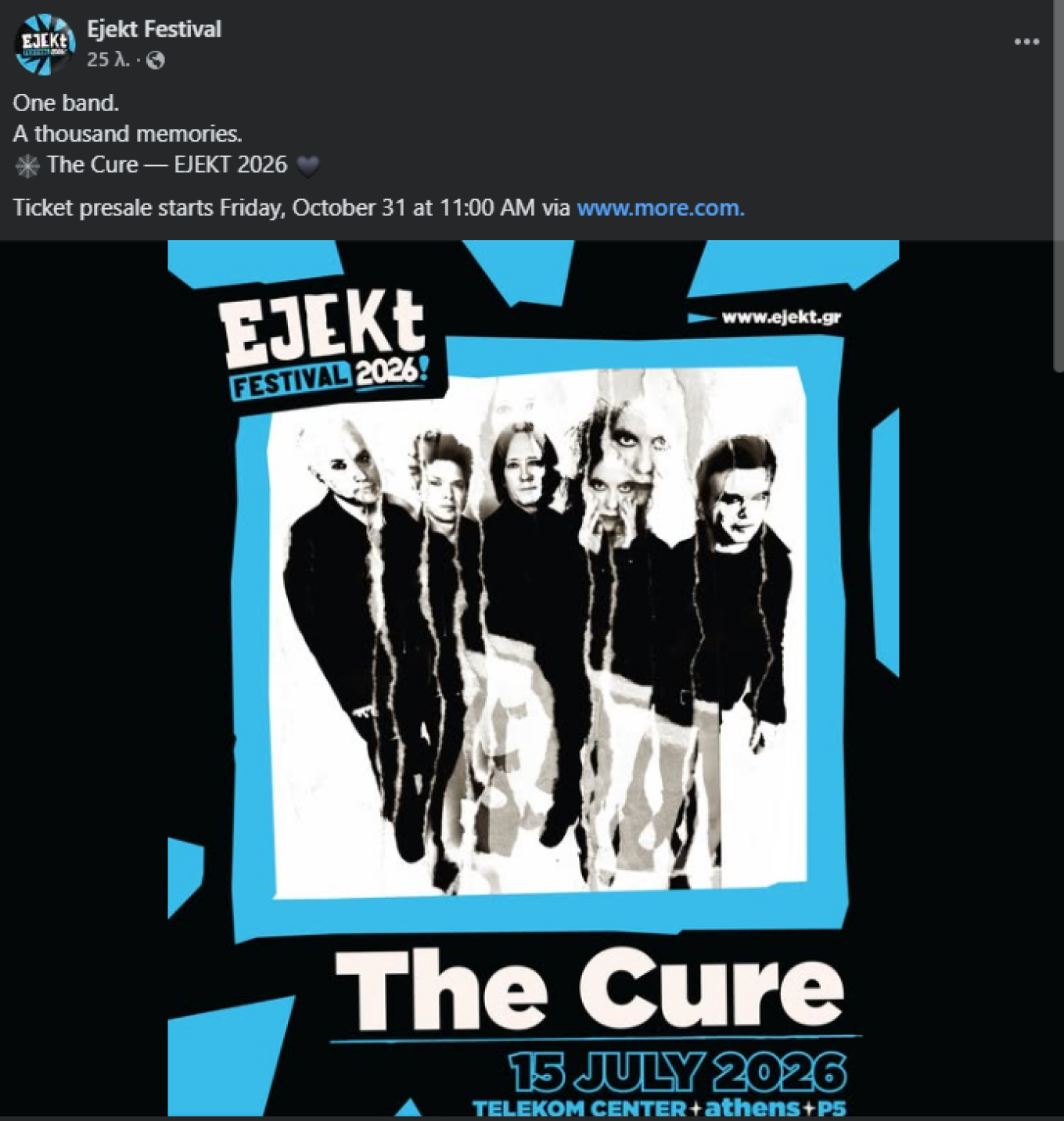 Στην Ελλάδα επιστρέφει για μια μεγάλη συναυλία το δημοφιλές συγκρότημα «The Cure». Η θρυλική μπάντα θα εμφανιστεί στο πλαίσιο του Eject Festival 2026.