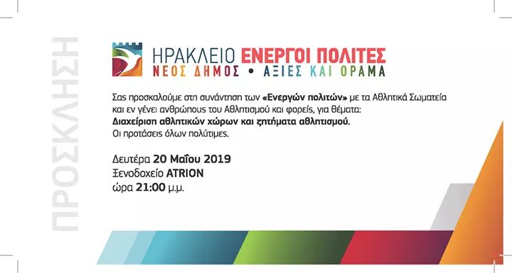 Η Δημοτική κίνηση « Ηράκλειο- Ενεργοί Πολίτες» με υποψήφιο δήμαρχο τον Ηλία Λυγερό, διοργανώνουν συνάντηση-συζήτηση, με τα αθλητικά σωματεία, με φορείς και ανθρώπους του αθλητισμού.